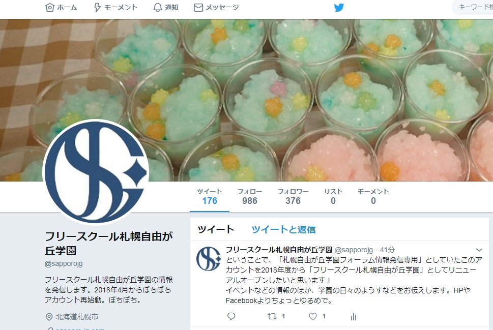 2018年度から「フリースクール札幌自由が丘学園」のアカウントとしてリニューアルオープンしました。