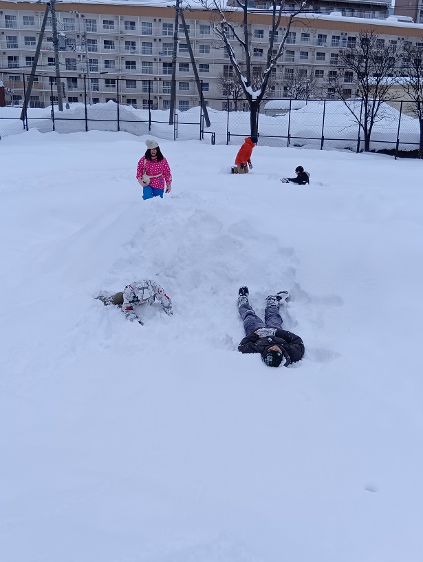 雪あそびの日ということで、近くの公園へ。ソリや雪合戦をして遊びました。