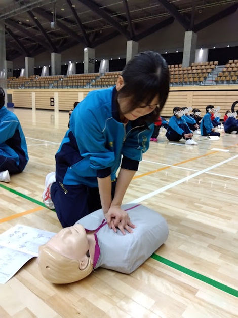 実際に心臓マッサージ(胸骨圧迫)を体験。